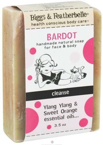 Biggs & Featherbelle - Bardot Handmade Natural Soap Ylang Ylang & Sweet Orange essential Oils For Face & Body Cleanse - 3.5 oz. Biggs & Featherbelle Health Conscious body care Handmade Natural Soap Bars. Biggs & Featherbelle soaps are handmade with unique recipes to meet the needs of different skin types, using the properties of natural resources to heal and nourish. Every ingredient is purposeful and free from synthetic fragrances, dyes and additives. Biggs & Featherbelle - Bardot Handmade Natural Soap Ylang Ylang & Sweet Orange essential Oils: Ylang Ylang Balances Sweet Orange Nourishes & Balances Excess Oil Olive Oil Moisturizes & Absorbs Easily Pink Kaolin Cleanses & Stimulates Biggs & Featherbelle Health Conscious Body Care: Handmade Natural Nourishing No Synthetics Frequently Asked Questions Who are Biggs & Featherbelle?Biggs & Featherbelle are somewhat fictional. Biggs (formerly named Bubba) is a character inspired from their cat named Diesel. Featherbelle is a fusion of Kelly & Kasey. Biggs & Featherbelle represent a broad spectrum of people from manly tough to girly sweet. The characters were developed and illustrated by their friend Brian Dugan (who prefers to stay behind the scenes). What is Sodium Hydroxide?Sodium Hydroxide is lye, an essential ingredient in soap making. Lye and oils react together to create soap therefore no lye is in the final product. In their recipes the amount of oil is always greater than the needed lye so that their bars are moisturizing and gentle to the skin. How do you make soap?Mixing oils and a lye water solution makes soap. Once the oils and lye are combined together, after vigorous stirring, the mixture thickens and is poured into molds. The molds are covered for 24 hours to allow the saponification process to occur. After the 24-hour period, the soap is taken out and cut into bars.